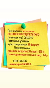Постовые записки о упокоении в Великий Пост помощь душам усопших сродников, друзей, благодетелей. 2-я, 3-я и 4-я субботы особые, сугубые, поминальные дни называемые родительскими. Проявляя поминальное попечение о ближних, мы оказываем не только поддержку им, но и приносим пользу своим душам. У Господа нет разделения на живых и усопших, у Него все живы. Подавая постовые записки, совершая церковное поминовение, совершается исполнение заповеди Божьей: относись к другим так же, какого отношения ты хочешь к себе.